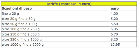 Per la spedizione di oggetti piccoli uso la Posta Raccomandata (non assicurata ma rintracciabile). Le tariffe sono presi dal sito delle Poste Italiane e cambiano in base di peso: